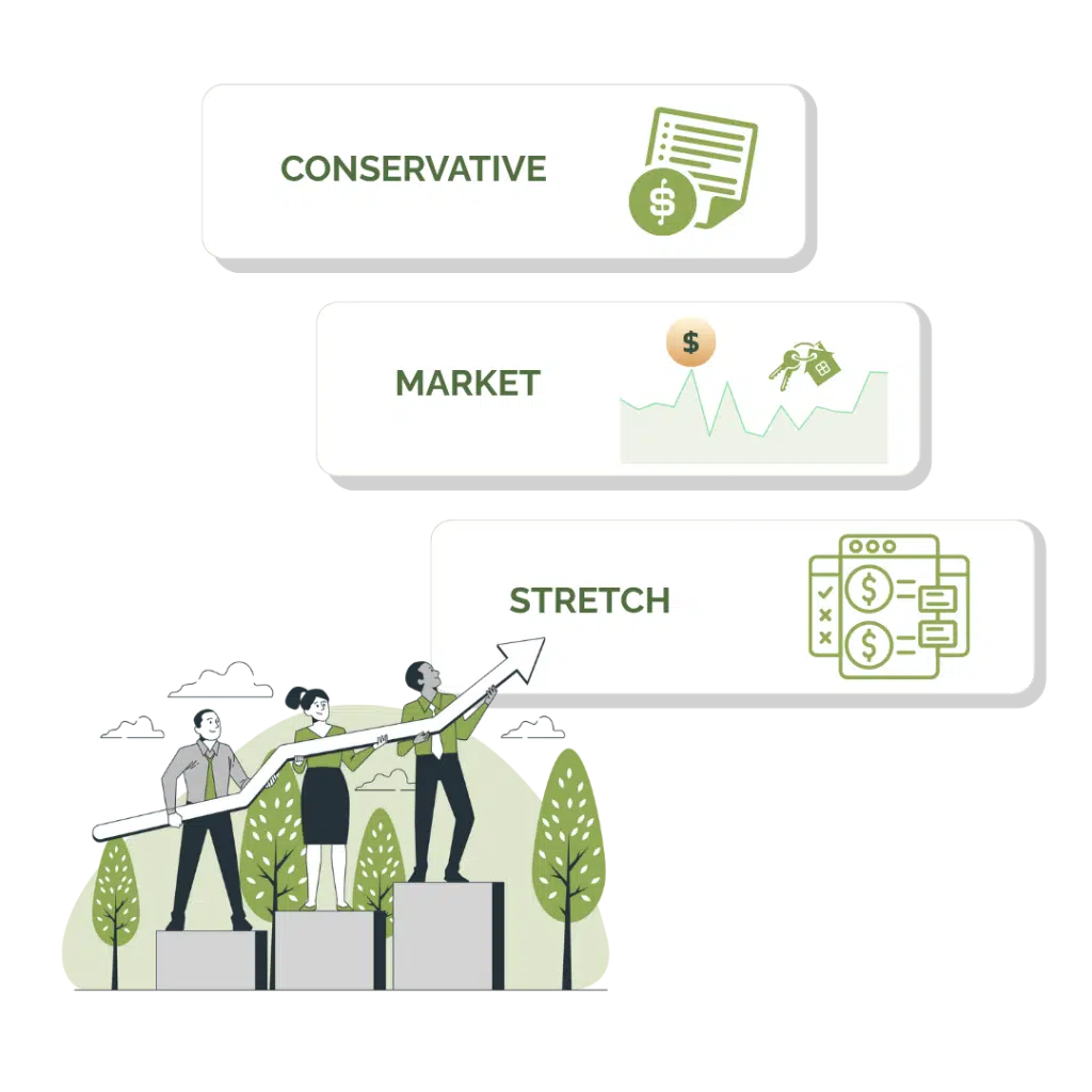 (Conservative / Market / Stretch with buyer interest)