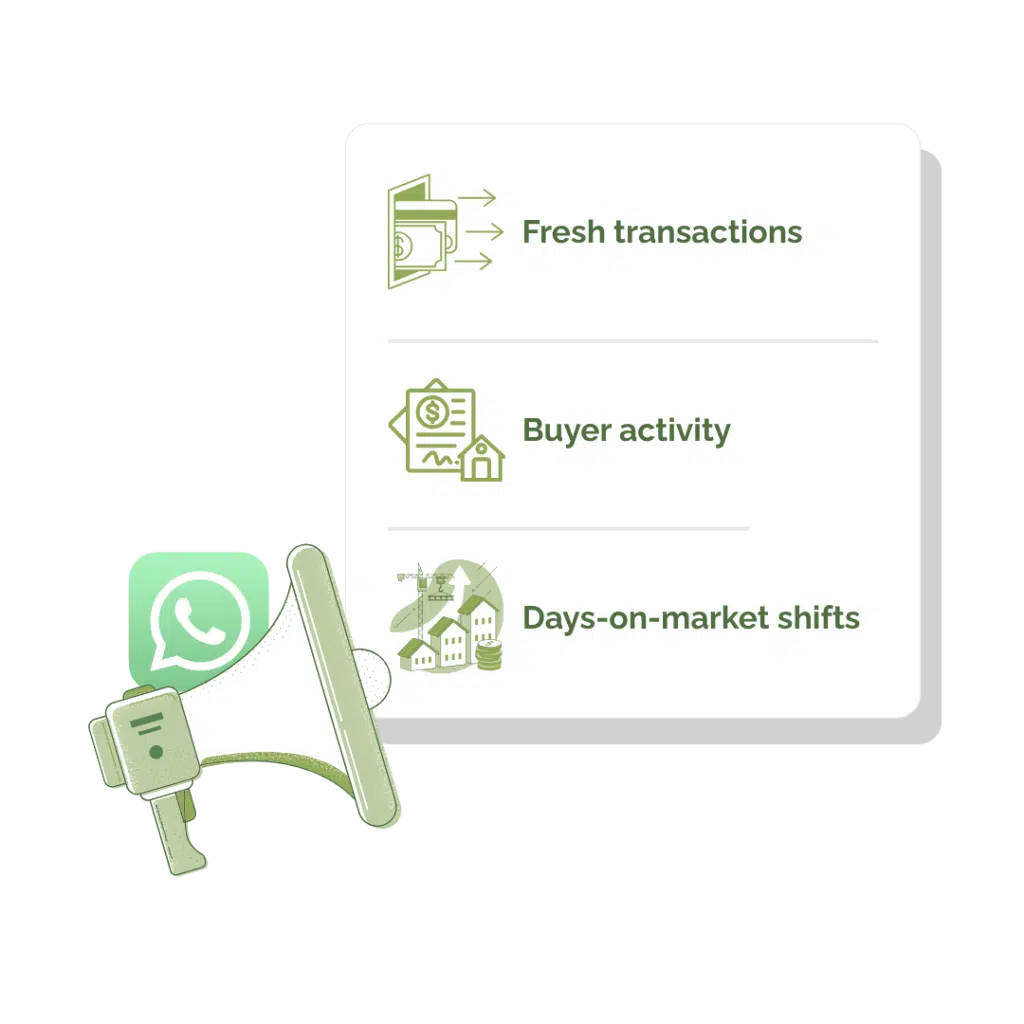 Weekly micro-updates on your block/estate: fresh transactions, buyer activity, days-on-market shifts, and action recommendations.