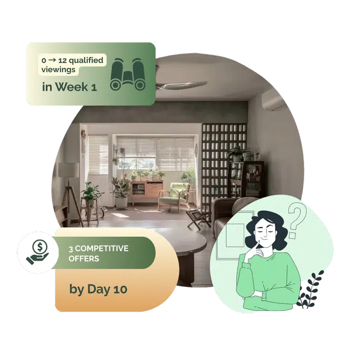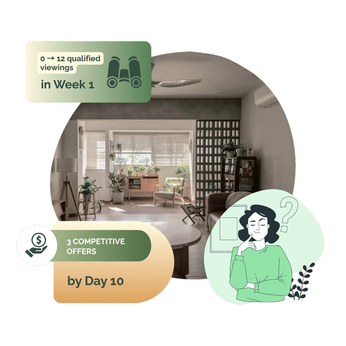 We set an attention-grabbing launch price, a deliberate action price to trigger offers, and a walk-away floor to protect the sellers’ goals. Using real-time ratios of enquiries to booked viewings, we made a measured micro-adjustment on day five—staying inside the data-backed band—to unlock the demand “sweet spot.”